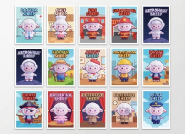 一组6个不同职业人物的插画集合,每个角色都采用相同的可爱卡通风格,圆润的线条,柔和的渐变色彩,简洁的造型,纯色背景,规整的网格排布。包括:穿着粉色护士服、戴着护士帽、手持病历夹的护士;穿着蓝色警服、戴着警帽、手持对讲机的警察;穿着白色厨师服、戴着厨师帽、手持锅铲的厨师;穿着绿色军装、戴着军帽、手持步枪的军人;穿着棕色邮递员制服、戴着邮递员帽、手持信件的邮递员;穿着橙色消防员制服、戴着消防头盔、手持水枪的消防员。每个角色都有微笑的表情和腮红,整体色彩明快活泼,职业特征鲜明。