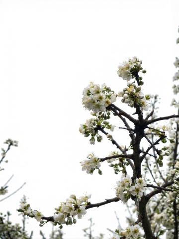 生成高清多朵山楂花图片,画面中密集分布的白色山楂花簇拥绽放,淡黄色花蕊清晰可见,搭配嫩绿叶片,背景为浅景深自然环境,整体清新明亮。