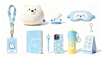可爱卡通小白熊主题周边,扁平风与软3D结合,温馨治愈趣味感,浅蓝色与奶黄色的温暖配色。