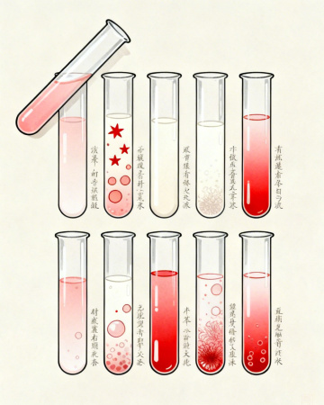 俯视角构图,极简主义实验室工作台面中央,一只戴着无菌白色丁腈手套的手正以毫米级精度操控着一支尖端极细的石英微量移液器,透明的液体弯月面在吸头末端形成完美的半球体,正悬停在一支刻有金色刻度线的硼硅酸盐玻璃试管正上方2毫米处,试管内装有三分之二体积的淡蓝色荧光溶液,底部沉淀着细密如星尘的白色颗粒,周围环绕着五只排列成正六边形的相同试管,每只试管内液体呈现出从浅蓝到靛蓝的渐变层次,背景是被柔和白光均匀照亮的浅灰色环氧树脂台面,左侧放置着一个带有蓝色LED指示灯的小型离心机,右侧是半开的磨砂玻璃试剂瓶,整个画面采用高对比度的蓝白灰三色系统,8K超高清分辨率捕捉到手套纹理和液体表面张力的微妙变化,浅景深使所有元素聚焦于移液动作的黄金分割点,营造出冷静、精准、近乎仪式感的科学美学。