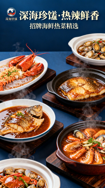 超写实美食摄影风格,俯视角特写构图,鲜活的波士顿龙虾、帝王蟹腿、新鲜生蚝、扇贝肉、大明虾等多种海鲜食材错落摆放于铺满冰块的黑色石板上,冰块表面蒸腾着大量白色烟雾营造出冷冽氛围,红色龙虾与橙色虾类形成鲜明色彩对比,生蚝壳内点缀翠绿香草,高对比度侧逆光勾勒出海鲜的细腻纹理与水珠光泽,背景为深色渐变增强主体层次感,整体画面展现海鲜的新鲜质感与高端食材的奢华视觉效果。