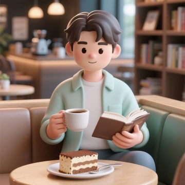 软3D风格卡通人物,简约主义设计,塑料质感材质,手持咖啡杯,呈现现代极简生活美学。