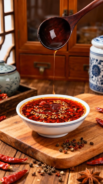 国潮风实景感,重拟物液态油滴入红油碗中,中式复古木桌配青花瓷,辣椒花椒环绕,视觉冲击力强。
