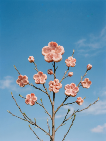 明媚阳光下绽放的粉色樱花特写,娇嫩花瓣呈现柔和渐变,花蕊点缀着淡黄色,纤细的棕色枝干支撑着繁茂的花朵,背景是纯净的浅蓝色天空,整体画面采用明亮通透的自然光,浅景深效果使前景樱花清晰锐利而背景逐渐柔和模糊,色调以粉白为主、蓝为点缀,营造出清新、浪漫、充满春日气息的氛围,高饱和度与柔和对比度展现出樱花的娇嫩质感与生机盎然。