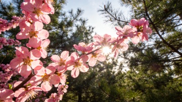 明媚阳光下绽放的粉色樱花特写,娇嫩花瓣呈现柔和渐变,花蕊点缀着淡黄色,纤细的棕色枝干支撑着繁茂的花朵,背景是纯净的浅蓝色天空,整体画面采用明亮通透的自然光,浅景深效果使前景樱花清晰锐利而背景逐渐柔和模糊,色调以粉白为主、蓝为点缀,营造出清新、浪漫、充满春日气息的氛围,高饱和度与柔和对比度展现出樱花的娇嫩质感与生机盎然。