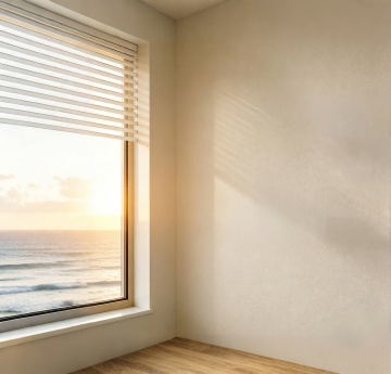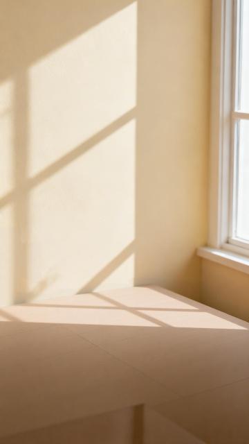 极简主义风格室内场景,温暖柔和的米白色墙面与浅色木地板,大面积自然柔光透过轻薄白色窗帘洒入,形成清晰的窗格光影投射在墙面与地面,角落处摆放着一个圆润造型的原木色陶瓷花瓶,插有干枯的芦苇花束,整体色调以米白、原木色、浅黄为主,营造出宁静、治愈、明亮通透的氛围,不同角度展现房间内部布局,可包含简约家具摆设,配色保持简约温暖的中性色系,光影层次丰富,质感细腻,空间感开阔。