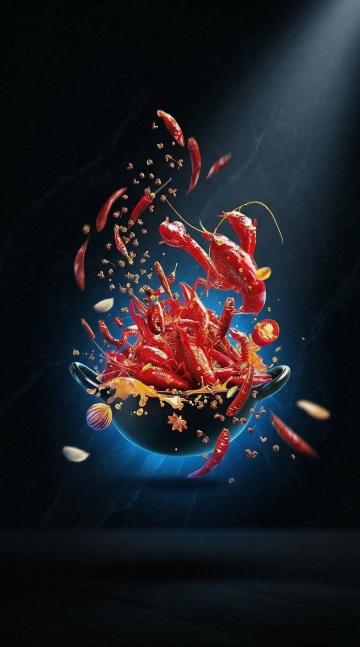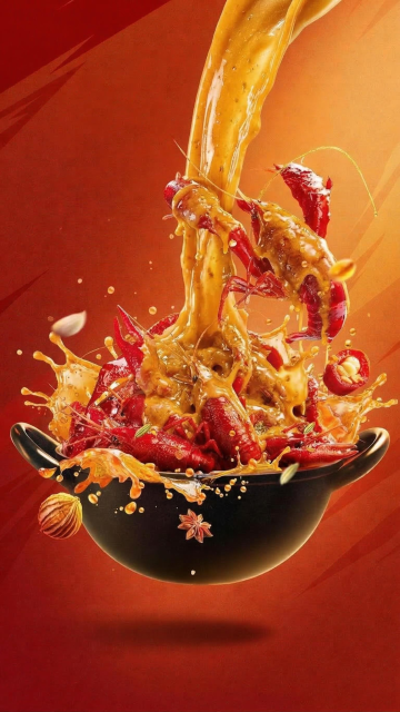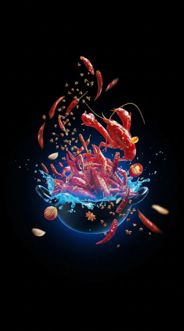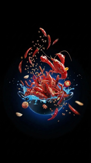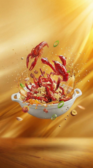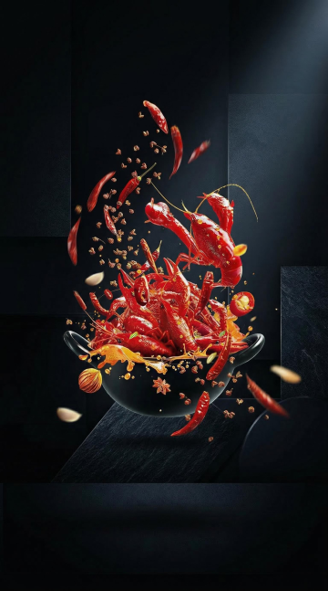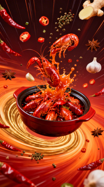 重拟物风呈现的油亮小龙虾,融合中式烹饪元素,实景感十足,光影交错间透出浓郁喜庆气息,液态汤汁与体积感外壳交织,油画质感尽显美食诱惑。