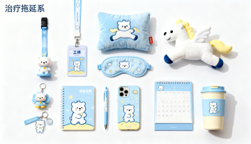 可爱小白熊主题周边,扁平风与软3D结合,浅蓝色和奶黄色的温暖搭配,温馨治愈风,小白熊元素贯穿全系列。