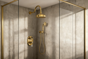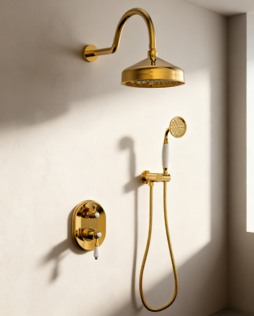 写实风格的浴室水龙头特写,黄铜色金属水龙头带有精致的旋钮和弯曲的出水口,清澈的水流正从龙头中流出,落入下方的白色陶瓷水槽,水槽边缘有细微的水珠反光。柔和的自然光从左侧窗户透入,在水龙头和水槽表面形成温暖的高光和柔和的阴影,背景中模糊可见绿色植物盆栽和木质纹理的墙面,整体营造出温馨、洁净、自然的居家氛围,画面具有浅景深效果,主体水龙头清晰而背景柔和虚化。