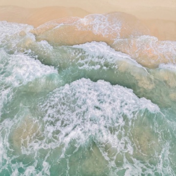 从高处俯瞰视角,纯净的浅蓝色海水,波光粼粼,海面上有白色的波浪,海浪拍打在沙滩上,溅起白色的浪花,远处是浅蓝色的天空,海天相接,画面清新、宁静、明亮,具有自然、简约的风格,色调和谐统一,光影柔和,营造出一种舒适、放松的氛围。