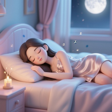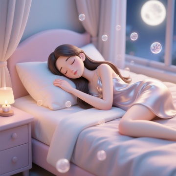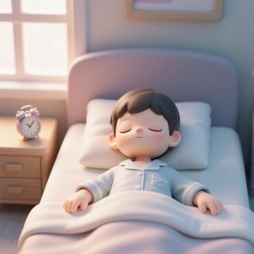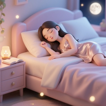 3D渲染风格,一个女孩躺在床上的全身像,她闭着眼睛,嘴角带着微笑,头发扎成一个丸子头,穿着白色带黄色条纹和圆点图案的长袖睡衣和长裤,头枕着一个紫色的枕头,身上盖着一条深红色的被子,右手抬起,左手放在被子上,双脚伸直,保持纯白背景,柔和的光线,清晰的边缘,光滑的材质,立体感强,卡通风格的3D建模,可爱的表情,温馨的氛围,细节丰富,高分辨率。