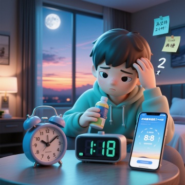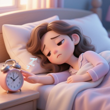 一个年轻女性躺在床上伸懒腰的插画,她闭着眼睛,嘴角上扬,面带微笑,脸颊有红晕,头发扎成一个发髻,穿着带有黄色条纹和圆点图案的白色睡衣,盖着深红色的被子,头枕着紫色的枕头,一只手向上抬起,另一只手放在被子上,纯白色背景,超现实主义风格,梦幻的光影效果,细腻的笔触,柔和的色彩过渡,富有层次感的构图,充满诗意和想象力的氛围,仿佛漂浮在云端。