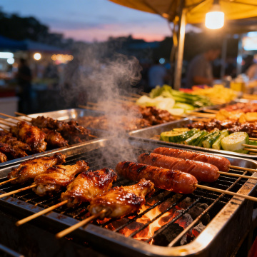 黄昏市集的炭火烧烤,暖色调光影交织,蒸汽缭绕中透出人间烟火的温馨与热闹,真实场景尽显生活气息与美食风韵。