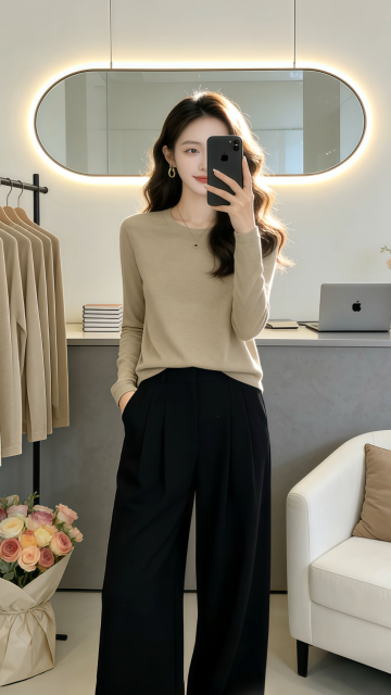 优雅柔光下的商务时尚穿搭,柔和色调与面料质感交织,实景空间营造舒适高级感,展现都市女性的从容魅力。