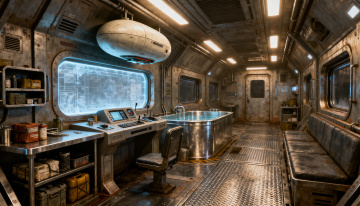 未来感科技舱,3D简约设计,金属与玻璃元素融合,虚拟现实视窗展现宇宙魅力。