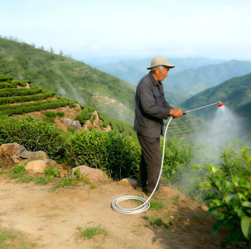清晨薄雾笼罩的茶园梯田,层层叠叠的绿色茶树整齐排列,远景山峦若隐若现,两位戴着传统斗笠的采茶人正在田间劳作,一位身着蓝色上衣,一位穿着浅色传统服饰,手持茶篓与竹编工具,晨光柔和地洒在湿润的茶叶上,空气清新湿润,整体呈现出宁静悠远的东方田园意境,绿色调为主,光影层次丰富,写实摄影风格,细节清晰,画面富有深度和空间感。