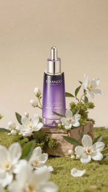 奢华感与优雅感交织,金属风瓶身搭配玻璃质感,3D渲染呈现光影流动,清新白花点缀绿缎背景,极繁主义细节彰显科技美学。