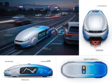 高速新能源断能补给小车,未来感十足的3D概念车,融合科技感与金属风,霓虹灯效点缀,机械臂充电设计展现虚拟现实交互,光影与体积感营造沉浸式视觉体验。