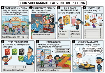 插画风卡通设计,拟人化动物角色,扁平色彩搭配温馨色调,展现可爱趣味的英语学习场景,节日氛围轻松愉悦。