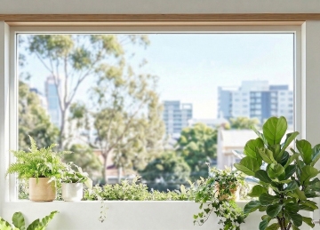 现代简约风格室内场景,不同角度和布置的大窗户,窗外是蓝天白云下的城市与绿色树林景观,窗台上摆放着绿植盆栽、透明玻璃杯和书籍,室内有白色懒人沙发、浅色地毯和木质小桌,温暖的自然光透过窗户洒入,光影柔和,色调以白色、浅木色和自然绿色为主,整体氛围明亮、宁静、舒适,展现不同窗户设计在空间中的布局与采光效果,突出窗景与室内陈设的和谐统一。