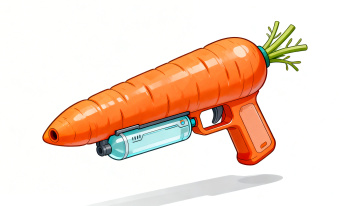 卡通感胡萝卜手枪,插画风结合轻拟物与软3D设计,科技感弹夹点缀,趣味十足的未来感创意。