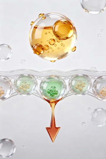 未来感科技风,3D液态玻璃质感,透明管道与金黄液体交织,重拟物设计展现清透流动之美,寓意高效渗透与科技护肤。