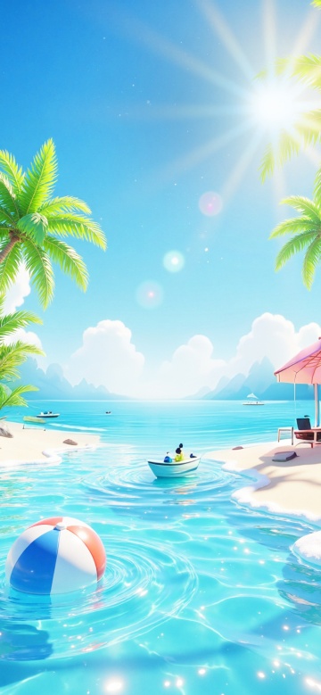 高饱和度渐变色彩的海边夏日场景,清澈透蓝的海水与天空相接,海面上波光粼粼,点缀着白色的海鸥飞翔,近处是金黄色的沙滩,散落着彩色的沙滩球和贝壳,两侧高大的绿色椰子树向中央倾斜,枝叶繁茂,天空中漂浮着蓬松的白色云朵,阳光明媚,光线充足,带有梦幻般的光晕效果,整体呈现出明亮欢快的氛围,具有鲜明的插画风格和细腻的质感表现。