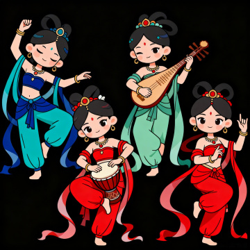 一组四幅规整排布的敦煌壁画风格系列素材,每幅均为纯色背景,保持唐代壁画特有的矿物颜料质感、古朴褪色效果、流畅飘逸的线条和装饰性图案风格。画面整体色彩分别变换为:1. 青绿色调为主,描绘反弹箜篌的伎乐天,身着青绿缠枝纹长裙,飘带呈淡蓝与白色;2. 赭红色调为主,展现吹奏笙箫的飞天,衣饰为赭红与明黄,点缀金色纹饰;3. 石蓝色调为主,刻画手捧莲花的供养菩萨,身披石蓝与月白袈裟,莲花为粉白渐变;4. 土黄色调为主,呈现手持琵琶起舞的乾闼婆,服饰为土黄与赭石色,飘带为浅褐与米白。所有人物姿态各异,均保持敦煌壁画的典型造型特征、面部神态和传统纹样,元素类目统一为佛教伎乐天/飞天/菩萨形象,整体构图平衡对称,四幅画面风格高度统一,仅通过主色调和所持乐器/物品形成区分,构成系列感。