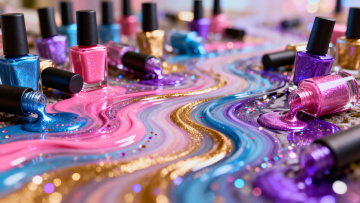 白色背景上,一团充满动感的抽象色彩飞溅图案,主要由明亮的黄色、橙色、粉色、蓝绿色和深紫色等鲜艳色彩构成,色彩间有自然的交融过渡,边缘呈现出不规则的、富有张力的笔触效果,整体形态如同颜料被快速挥洒而成,具有液态金属的光滑质感和强烈的光泽感,色彩饱和且富有层次,光影效果突出,给人一种活力四射、流动飘逸的视觉感受。