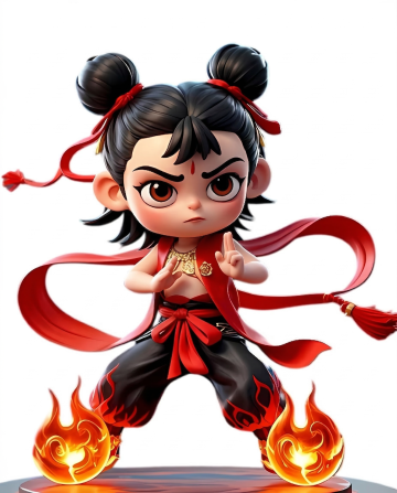 宫崎骏绘画风格,深邃黑色背景上,流动的火焰以抽象的形态呈现,火焰边缘柔和模糊,非具象化处理,主要由暖红色、橙黄色和少量金色的渐变光效构成,带有大量细小的火星和光斑随机散布,整体呈现出一种动感、热烈且神秘的氛围,光影层次丰富,具有强烈的视觉冲击力和梦幻般的质感,哪吒脚踏风火轮,从火中重生,眼神凌冽,表情坚定,向前冲刺