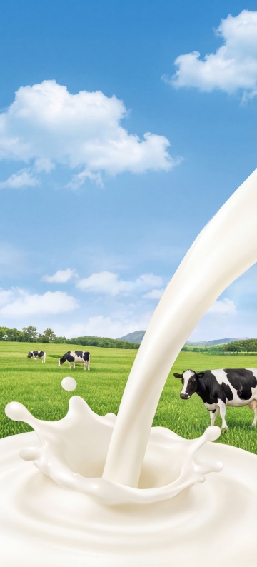 高清晰度3D渲染风格,以明亮阳光照耀下的绿色草原为背景,远处有起伏的青山和白色云朵点缀的蓝天,前景是动态飞溅的牛奶,展现出光滑细腻、富有光泽和流动性的质感,牛奶飞溅形成优美的弧线和众多悬浮的圆润奶滴,草原上有两头黑白花奶牛在悠闲吃草,整体色调以清新的蓝绿色为主,光影明亮柔和,营造出自然、纯净、生机勃勃的氛围,画面层次分明,视觉焦点突出,具有强烈的视觉冲击力和田园牧歌式的宁静美感。
