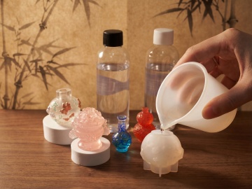用图片生成效果图,外罩大理石纹理,瓶身上深黄色渐变到青蓝色全透玻璃瓶身,并精修瓶子,4K高清摄影效果