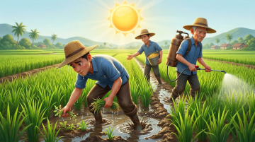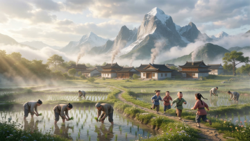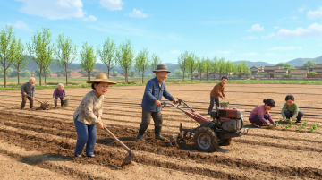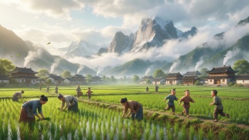 软3D风可爱童子,拟人化乡村场景,粘土质感搭配质朴农舍与牛,温馨卡通感十足,展现田园节日氛围。