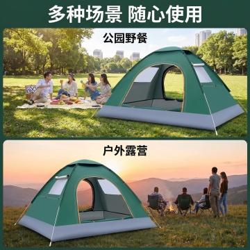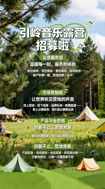 实拍场景户外露营场景(草地、帐篷、绿树),圆润的手写体,大标题“说走就走的毕业季” ,小标题“轻松旅行用镜头捕捉绿色风景身心放松亲近自然”。