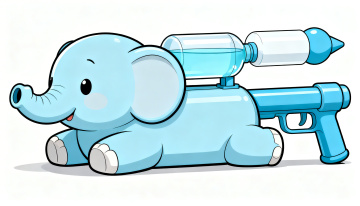 卡通风格可爱小象拟人化水枪,软3D质感搭配描边线条,趣味十足的插画设计,适合儿童节主题。