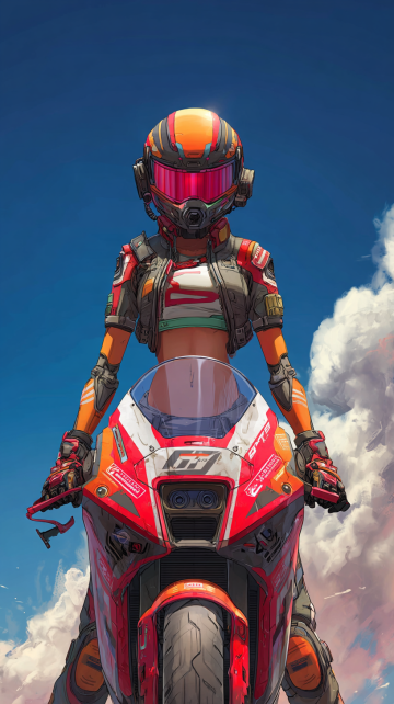未来感与科技感交融的动漫风插画,热血骑士驾驭金属质感机车,冲击力十足的视觉设计,展现虚拟现实中的机能美学。