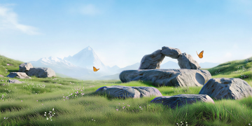 3D风虚拟自然景观,融合水彩与油画质感,呈现清新柔和的实景感,绿意盎然的山峦与雏菊点缀,营造舒适宁静的春日氛围。