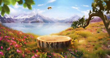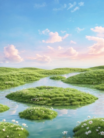 3D风虚拟自然景观,水彩质感融合油画笔触,呈现清新清透的草原湖景,柔和光影营造静谧舒适氛围,传递夏日自然之息。