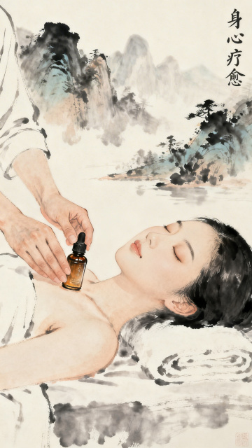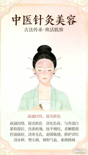 工笔风插画,拟人化呈现中医针灸美容场景,融合水墨与水彩质感,古典云纹边框烘托中式意境,展现传统医美文化。