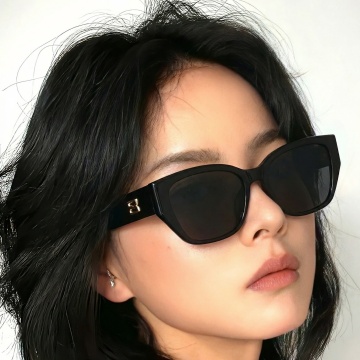 简约现代风格的墨镜产品图片,纯黑色背景,中央规整排布一副墨镜,墨镜为多边形镜框设计,镜框为金色金属材质,镜片为纯黑色,镜腿末端为黑色,整体造型简洁利落,无任何文字、logo和水印,光线均匀柔和,突出墨镜的线条感和材质质感。