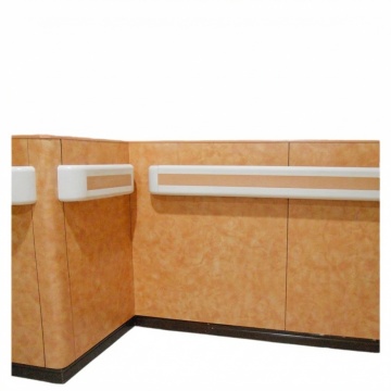 超写实风格医院走廊内部场景,明亮柔和的自然光与人工照明结合,天花板嵌入式筒灯与长条灯带提供均匀光线,地面为光滑反光的浅蓝色环氧地坪,墙壁采用浅蓝色与米白色渐变搭配,白色方形吊顶,走廊左侧为弧形护士站,配备电脑、文件架和绿色盆栽,右侧摆放医疗设备与座椅,整体色调以蓝白为主,营造干净、专业、宁静的医疗氛围,空间宽敞通透,景深效果明显,光影过渡自然,细节清晰,无LOGO、电话地址及二维码。