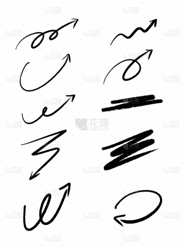 一张白色背景上以规整排列方式展示多种黑色手绘风格线条元素的设计图,包含流畅的曲线、封闭的椭圆形、不规则波浪线、直线以及简约符号等,线条粗细均匀,边缘略带自然手绘的细微毛躁感,所有元素按行列整齐分布,形成清晰有序的视觉布局,整体呈现出简洁、现代的设计感。