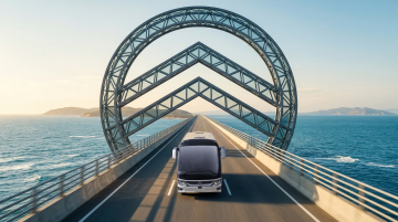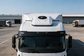 现代感十足的白色冷链卡车,融合工业风与科技感设计,金属质感车身搭配清晰光影,展现重拟物3D风格与实景质感。