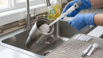 现代简约风格厨房场景,不锈钢材质的银色水龙头安装在白色石英石台面上的嵌入式水槽边缘,水龙头线条流畅、设计简洁,带有弯曲的出水嘴和旋钮式开关,表面光滑且有金属反光质感。台面干净整洁,左侧窗台上摆放着一盆盛开的白色百合花,右侧窗台上放置着几个新鲜的青柠和柠檬,窗外透进明亮的自然光,光线柔和地洒在台面和水龙头上,形成淡淡的阴影和高光,整体氛围清新、明亮、整洁、温馨,具有现代家居的舒适感和简约美学。