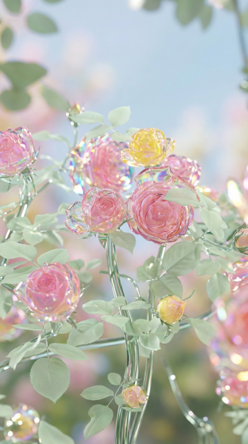 梦幻3D风格,虚拟自然场景,玻璃质感花朵与气泡,营造仙境般氛围。