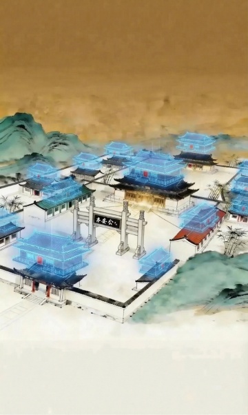 中式古典场景,3D重拟物风呈现古代城建实景,水墨与岩彩元素融合,人物服饰考究,展现先民筑城劳作的生动画面。