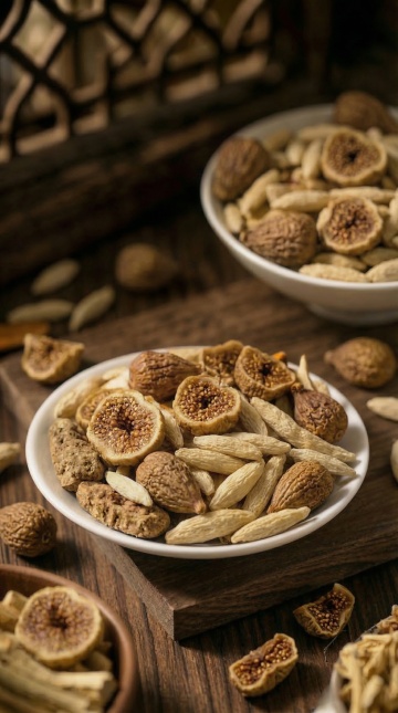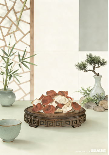 中药元素静物摄影,整体采用清新雅致的青绿色调,柔和的侧光营造出温暖细腻的光影效果,木质桌面上摆放着各种中药材,包括切段的党参、切片的黄芪、整根的天麻,旁边是打开的古旧医书、卷轴和空木盘,右侧黑色茶壶置于竹制底座上,背景中一枝白色花朵的树枝自然垂落,画面构图遵循三分法,物体质感清晰可见,氛围宁静古朴,具有传统中医药文化的韵味。