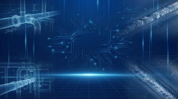 以深蓝色为主色调,搭配橙色作为点缀,采用几何抽象风格的齿轮图案设计,齿轮元素以对角线构图从右下角向左上角延伸,大小齿轮相互咬合形成动态视觉效果,中心位置放置一个带有对话气泡图标的齿轮作为视觉焦点,齿轮边缘有精细的白色描边,整体画面具有强烈的金属质感和立体阴影效果,背景为渐变的深蓝色,营造出科技感与机械美学的视觉氛围。