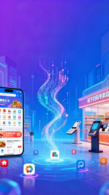 未来感与科技感交融的3D赛博朋克风场景,霓虹光影流动,粒子特效连接手机与虚拟商店,展现沉浸式数字生活体验。