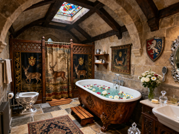 超广角镜头,一座被远古藤蔓半掩的中世纪石砌城堡厚重橡木大门,深褐色木纹中镶嵌着生锈的铁制十字铰链,门上对称分布着四个菱形彩色玻璃窗,中央悬挂着巨大的青铜门环,两侧是爬满常春藤的灰色石墙,门后透出摇曳的烛火暖光,门前石阶上散落着几片深红枫叶,黄昏的金色阳光斜照在门扉上,空气中漂浮着微尘与古老木头的气息,整体色调是沉稳的赭石色与温暖的琥珀色交织,营造出神秘而庄重的历史感。